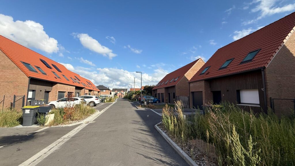 Le Hameau des Weppes porte bien son nom : 13 maisons, isolées ou groupées, proposant une alternance de vides et de volumes construits en RDC + combles habités. Ce rythme est gage de respiration et de vues vers les paysages alentours. Le fond d’impasse n’étant pas bâti, il participe lui aussi à l’ouverture sur les paysages.