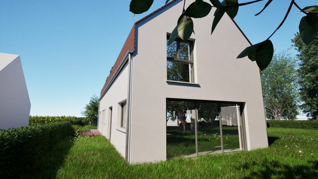 Afin d’optimiser au mieux la parcelle étroite et en longueur, la maison est de forme simple. Le volume rectangle présente son plus petit côté à l’espace public. La zone d’accueil dans la partie du terrain côté rue est plus minérale. L’arrière de la parcelle se développe en jardin. On rentre dans la maison en son milieu, par le côté. Afin de répondre à l’environnement existant, la maison propose une toiture traditionnelle en tuiles, à 2 pans. Les tuiles se retournent sur une partie de la façade de l’étage. Cette écriture plus contemporaine permet d’implanter des fenêtres d’angle de toit dans les chambres de l’étage tout en optimisant la gestion des eaux pluviales en proposant une seule gouttière qui file pour souligner l’horizontalité.