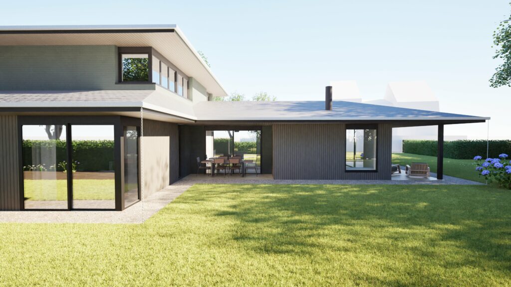 La façade Sud abrite une terrasse, en lien avec la pièce de vie qui s’ouvre largement sur le jardin. Cette terrasse profite d’une avancée de toiture, qui abrite de la pluie, protège du soleil et intimise cet espace ouvert. Ces deux volumes se répondent de part le traitements des toitures débordantes, qui créent des ombres et un écrin pour cette maison en cœur d’ilot